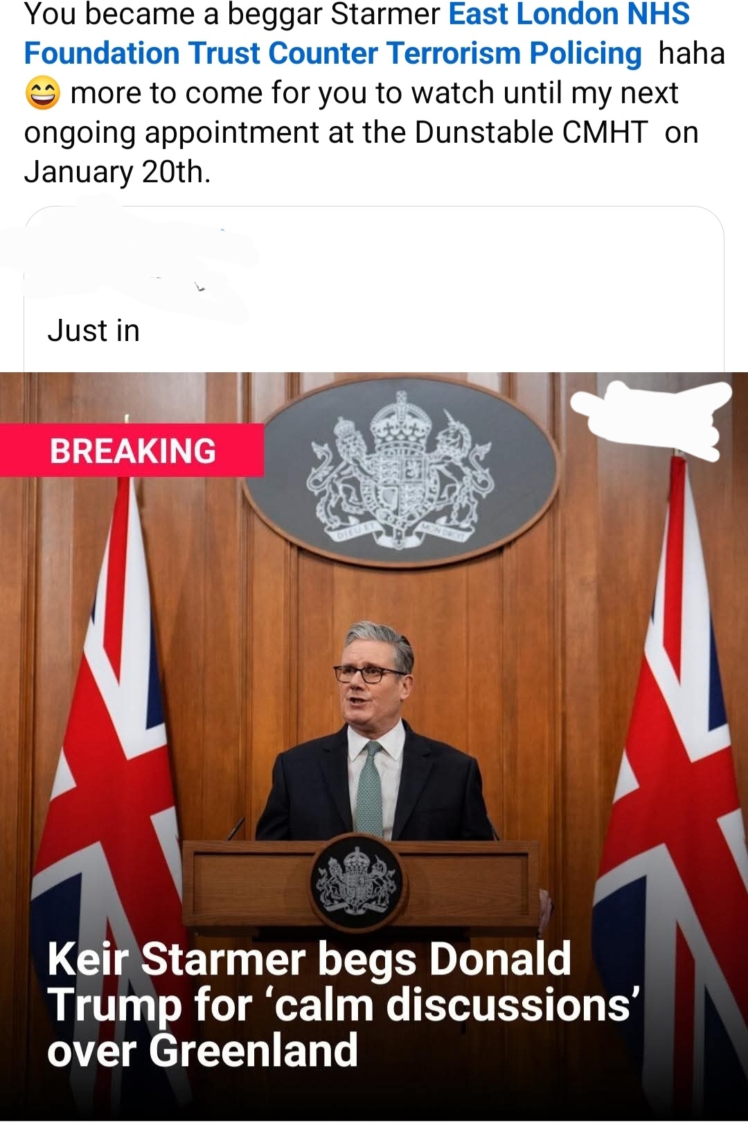 Metro I don’t know whether Trump will ever attack the United Kingdom, but he will certainly attack and annihilate Kier Starmer and the Labour Party. If you have any doubts, then contact and ask Dr Ishan Rajaram from East London NHS Foundation Trust Dunstable CMHT haha 😄